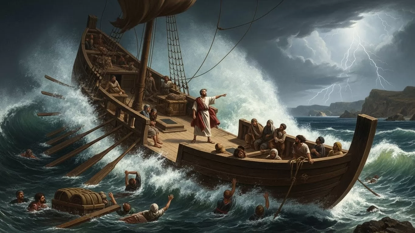 - O Naufrágio: O navio enfrentou uma tempestade terrível (o Euro-aquilão) por 14 dias. Paulo assumiu a liderança moral do navio, encorajando os 276 passageiros. O navio se despedaçou, mas todos se salvaram, nadando até a ilha de Malta.