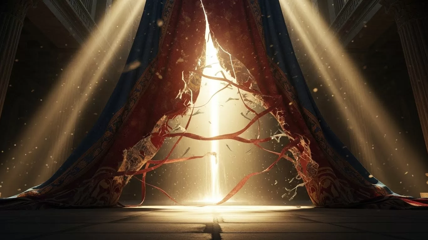 Dramatic interior view of the Holy Place, looking towards the massive veil, the fabric tearing violently from top to bottom, intense divine light pouring through the rip, dust motes dancing in the light beams, symbolizing the death of Christ.