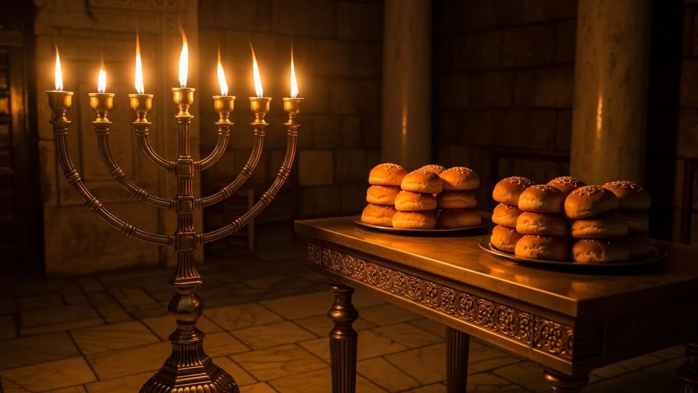 The Golden Lampstand (Menorah) burning brightly in a dark room, olive oil lamps flickering, illuminating the golden table of showbread nearby, rich warm tones, detailed metalwork.